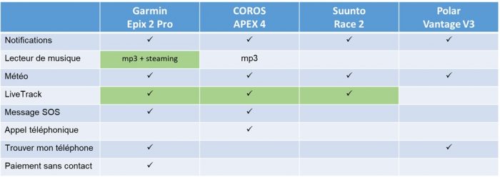 Comparaison des fonctionnalités sportives