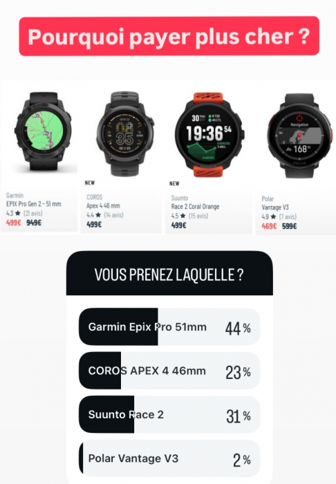 - 44 % seulement pour l’Epix 2 (je ne sais pas si c’est par désamour pour Garmin, parce que certains l’ont déjà ou par peur d’acheter une montre GPS qui peut sembler vieille)