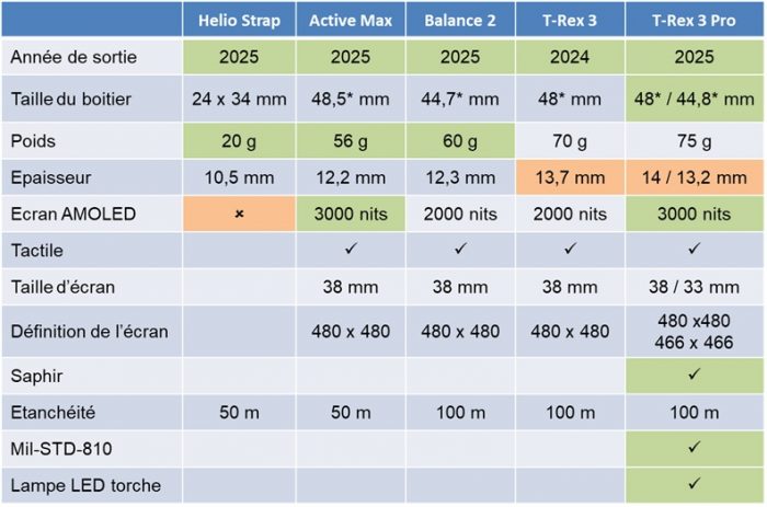Le point commun (point fort ou point faible, c’est selon), c’est qu’Amazfit a construit sa stratégie sportive sur des montres GPS avec un grand écran et donc un gros boitier. D’autant que les valeurs affichées dans ce tableau sont la largeur du boitier circulaire, auquel il faut rajouter les différents renforts ou excroissances. Les T-Rex 3 et T-Rex 3 Pro font en réalité 51 mm si l’on inclut la garde métallique sur le côté droit. La Balance 2 affiche 49 mm de largeur maximale avec ses renforts de chaque côté. Les petits poignets auront du mal à trouver leur bonheur ici. Notez que même sans ça, la T-Rex 3 Pro 44 mm est plus proche des 45 mm que des 44…