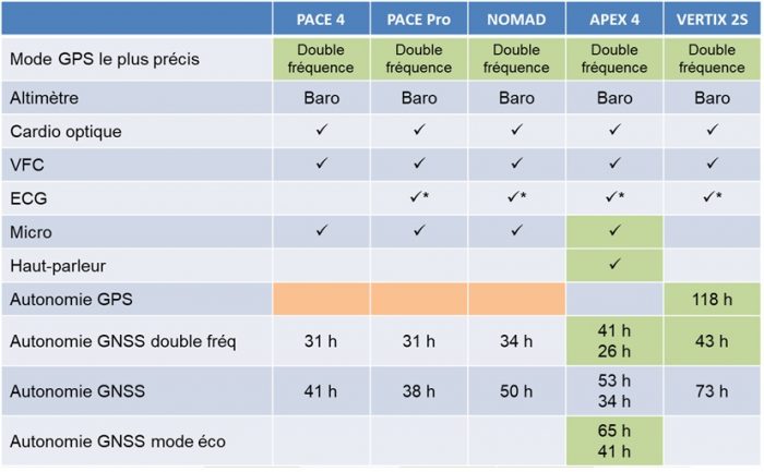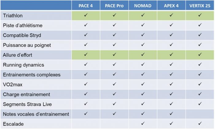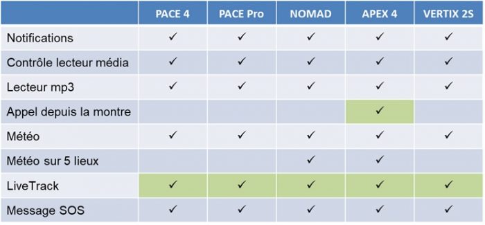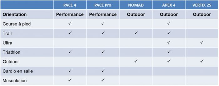 Là, on distingue bien la PACE 4 destinée à la course sur route des 4 autres montres GPS qui peuvent également couvrir les besoins des sportifs outdoor.