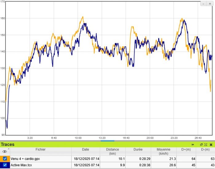 Je dois quand même préciser que pour ces activités, la Venu 4 est en mode GPS seul, là où l’Active Max est en principe en mode multi GNSS. Il y a quand même quelques fois où le mode GPS + le lissage donne de meilleurs résultats.