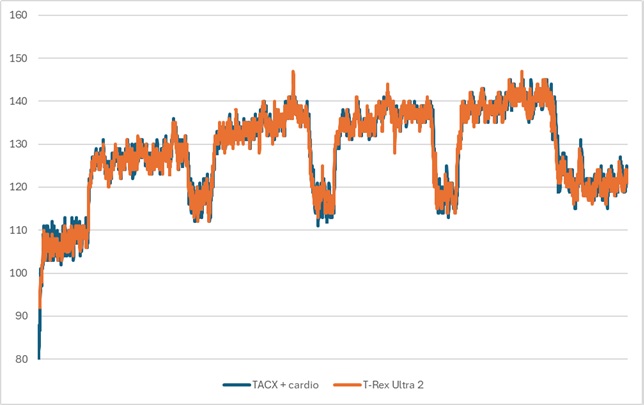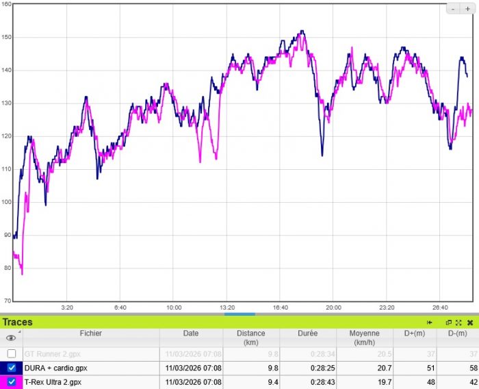 Pour ce qui est du cardio, la T-Rex Ultra 2 paye, à mon avis, son poids. Les grosses montres GPS ont tendance à plus balloter, même si on sert bien le bracelet. Je pense que c’est ce qui explique les petits trous dans la courbe de fréquence cardiaque.