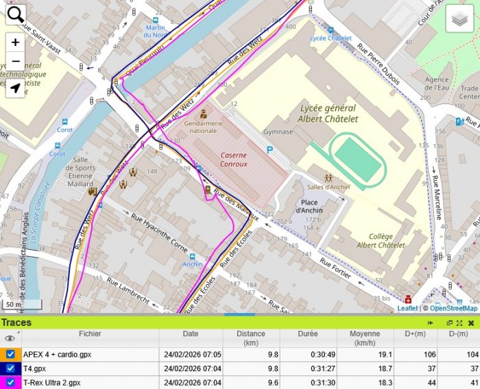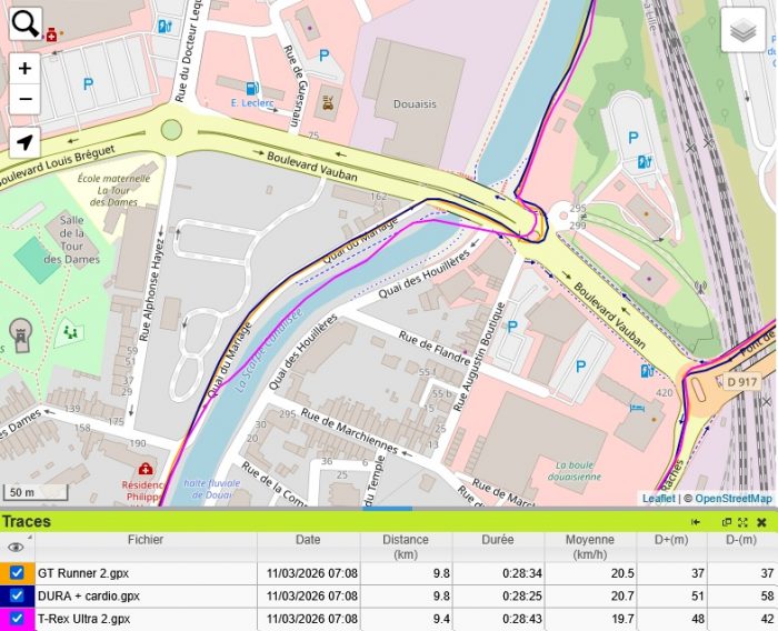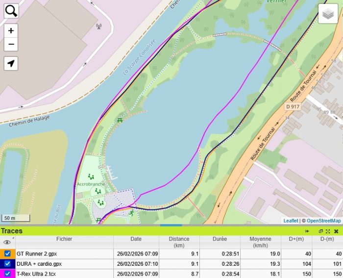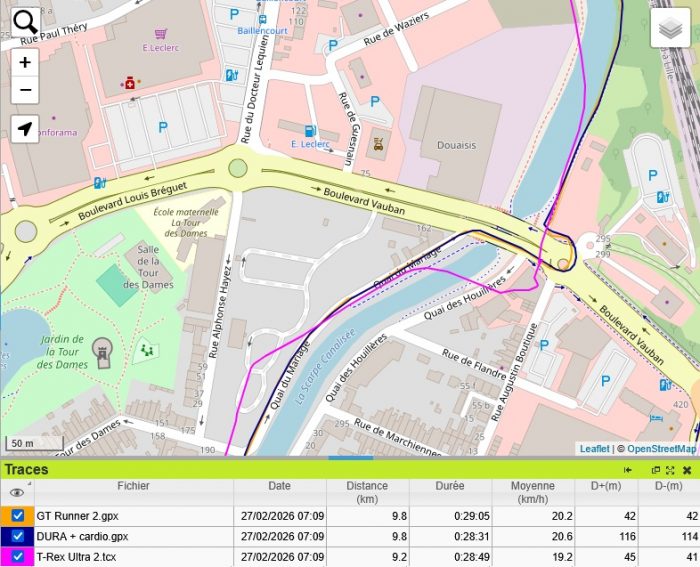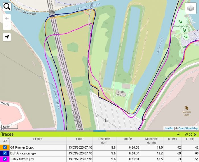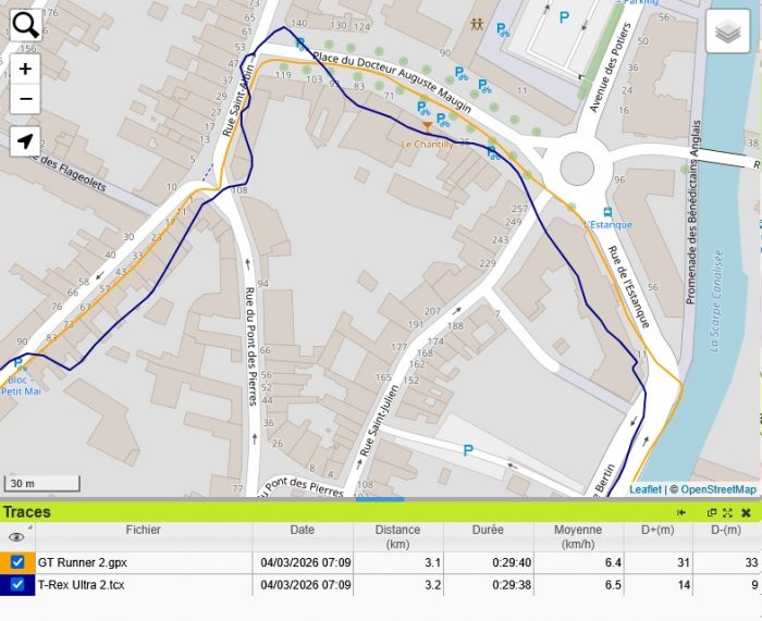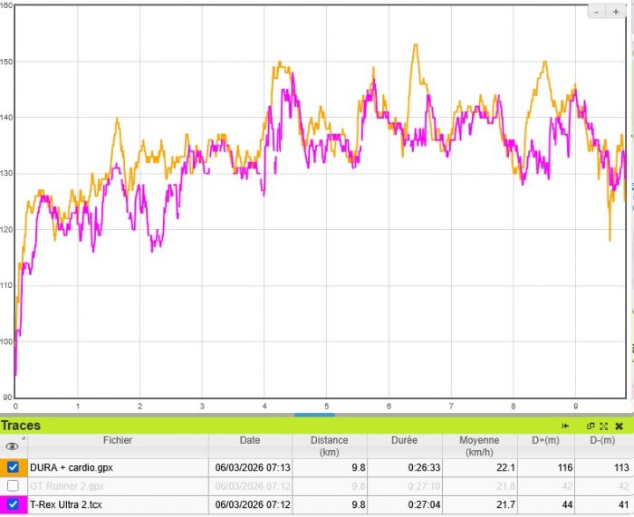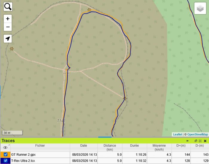Quoi qu’en ville, la T-Rex Ultra 2 reste moins précise que la GT Runner 2. Alors que les 2 sont en multi GNSS double fréquence.