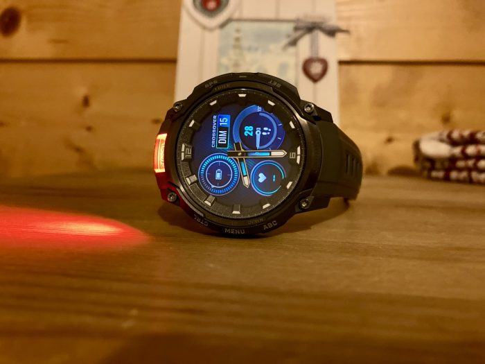 Le bracelet fixé au haut du boitier forme une grosse encoche au niveau de laquelle se trouve la lampe torche à LED. Cette lampe s’active très facilement par une double pression sur le boutons Light et possède 4 niveaux d’intensité de blanc, plus 1 de rouge. Cet accessoire divise encore pas mal : il y a ceux qui n’ont jamais essayé qui pensent que c’est gadget et ceux qui ont déjà une montre GPS avec lampe torche et qui s’en servent régulièrement. Moi, j’ai fait partie du groupe 1 au début mais j’ai rejoint le groupe 2 maintenant.