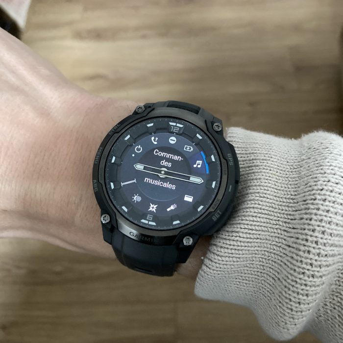 Mais lorsqu’on lève le poignet ou qu’on appuie sur un bouton, l’écran AMOLED de 390 x 390 pixels en-dessous des aiguilles s’illumine. Et là, c’est beau. C’est d’autant plus beau qu’aiguilles et écran sont coordonnés. En mode montre, les widgets de la watchface se positionnent de telle manière que les aiguilles qui indiquent l’heure ne les masquent pas (donc ils changent de position en fonction de l’heure). Et inversement, lorsqu’on fait défiler un menu, ce sont les aiguilles qui bougent pour ne pas masquer quoi que ce soit. Et parfois, les aiguilles bougent et conservent leur rôle d’aiguilles, pour indiquer le nord de la boussole, par exemple.