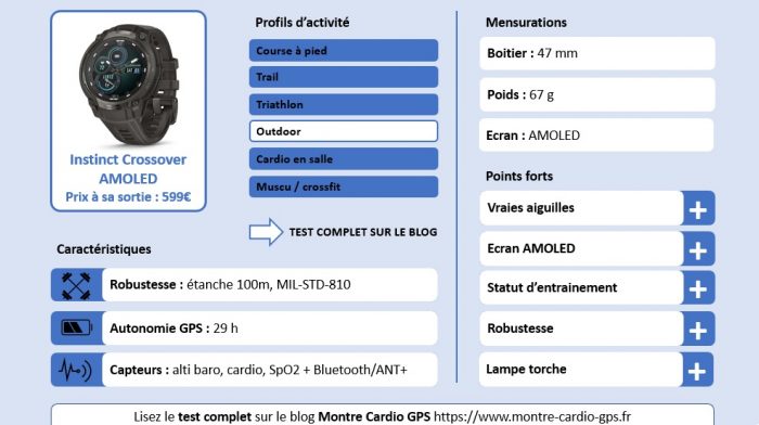 Plus que jamais, l’Instinct Crossover AMOLED est une montre connectée qui fait tout : entrainement sportif, navigation, suivi santé, montre connectée et aussi montre toute simple qui donne l’heure avec des aiguilles. Très originale et sans concurrence.