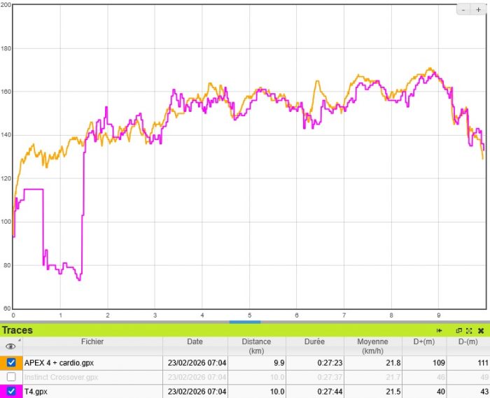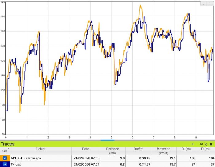 La T4, sur une séance plus irrégulière, s’en sort aussi pas trop mal. Mais c’est quand même moins précis, avec des erreurs de 10 bpm sur les pics et les creux de FC.