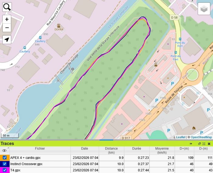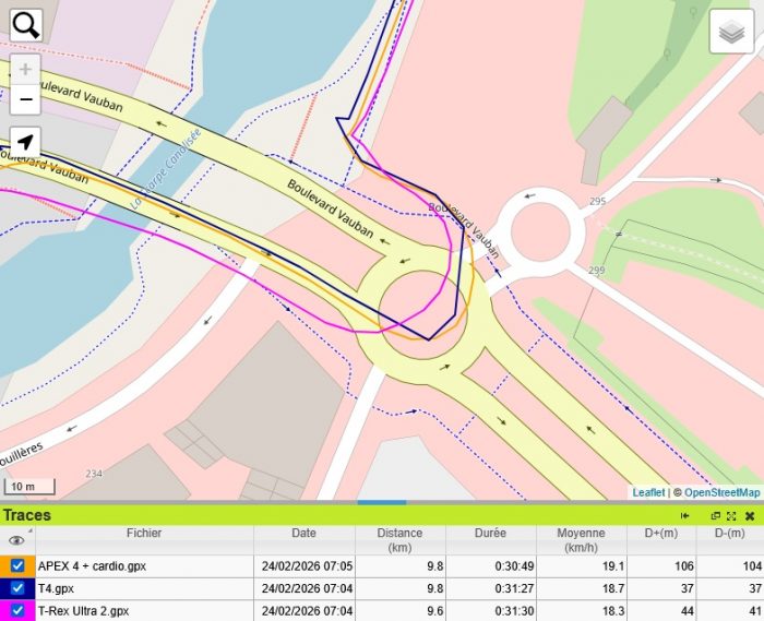Je ne me suis pas méfié et j’ai merdé. L’application Apexmove ne permet d’exporter que les itinéraires au format GPX ou KML. Ca ne comprend que les données GPS et n’inclut pas les données de FC. Donc je ne pourrai qu’étudier la précision GPS et pas la précision cardio. Dommage, parce que les données du capteur cardio optique me semblaient bonnes pendant mes séances.