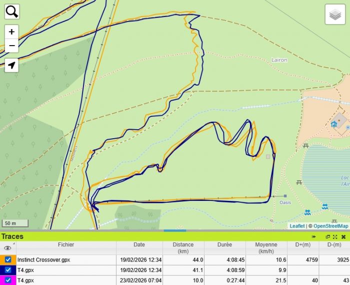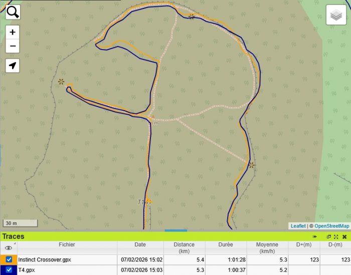 La T4 s’est révélée très mauvaise à ski. Ou plus précisément sur les remontées mécaniques. Regardez le télésiège qui traverse l’image de haut en bas, la trace GPS de la T4 dévie largement vers la gauche. Et c’est comme ça sur presque toutes les remontées. Je ne sais pas pourquoi. Mais à l’arrivée, le début de la descente, c’est du n’importe quoi, à cause de ce décalage.