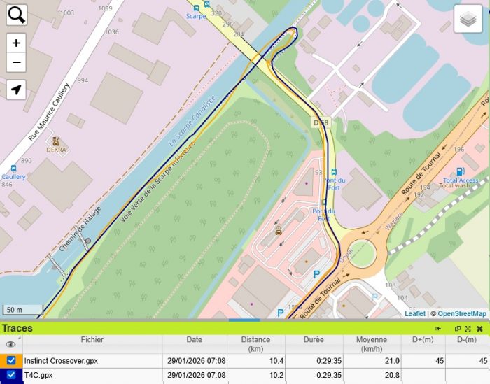 C’est pas la même dans le mode GPS éco. En fait, ce n’est pas un simple mode GPS seul. Il y a réellement un algorithme d’économie d’énergie. Ca se voit très bien sur ce rond-point, avec des grands traits droits au lieu d’un bel arrondi. On voit bien que sur la trace GPS de la T4, il n’y a pas 1 point GPS par seconde.