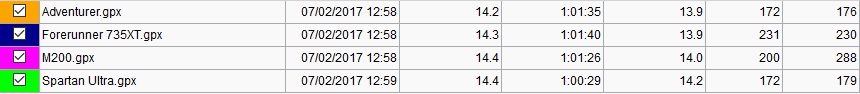 Si vous vous demandez quel est l’impact de l’augmentation de l’autonomie dans le mode randonnée (1 point GPS toutes les 2s) sur la précision, voici une illustration claire sur une sortie en ski de randonnée. En montée (partie du haut de l’image), j’ai progressé à une moyenne d’environ 3km/h. On voit que la trace de l’Adventurer suit la trace de la Forerunner 735XT qui était en mode GPS 1s et reflète bien mon itinéraire. Dans la descente, en revanche, les choses se passent différemment (partie du bas de l’image). Ma vitesse sur cette portion oscillait entre 20 et 40km/h. Dans une telle configuration, 1 point toutes les 2 secondes n’est plus satisfaisant. Les virages sont coupés et à l’arrivés, cela crée une erreur de 500m (presque 6% de moins).